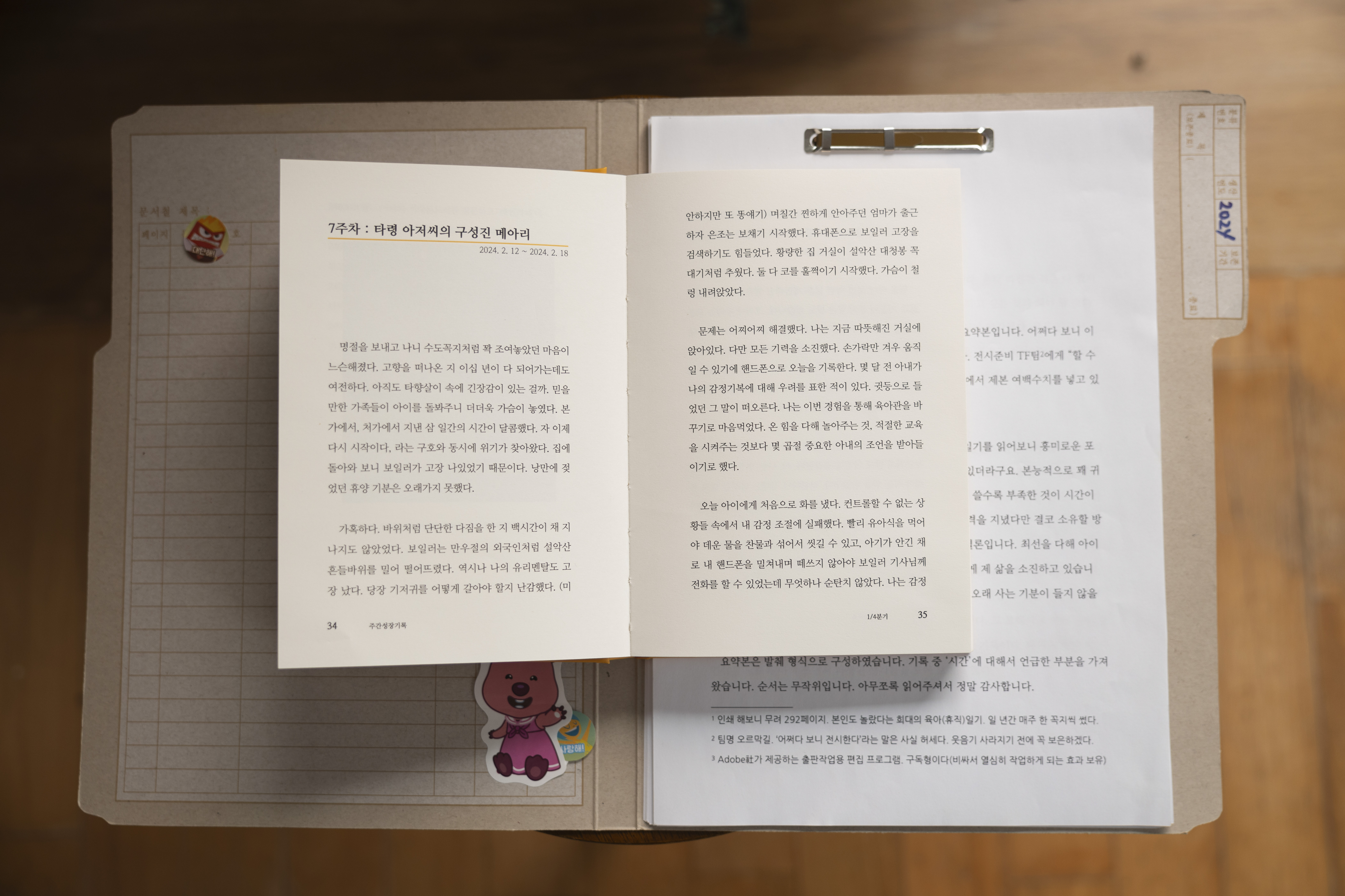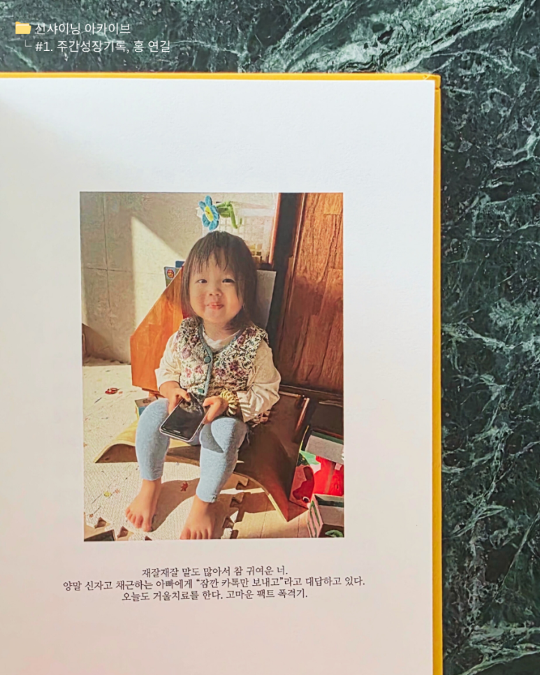 다른 장에는 아이의 사진이 붙어 있습니다. 짧고 단호한 말투로 아빠를 향해 “잠깐 카톡만 보내고!”라고 말하는 모습, 그 한마디마저도 아빠에게는 귀여운 팩트 폭격기로 남습니다. 이렇듯 기록 속에서는 아이와 아빠가 함께 자라납니다.