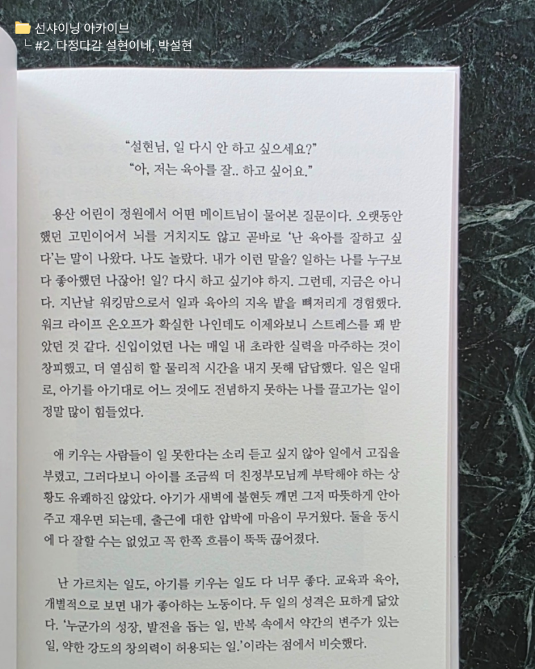 그래서일까요. 설현 님의 일기를 읽으면 늘 이런 마음이 듭니다. “그린이와 온이는 참 좋겠다. 이런 엄마가 곁에 있고, 이런 기록이 있어서.” 하지만 그녀는 이렇게 말합니다.