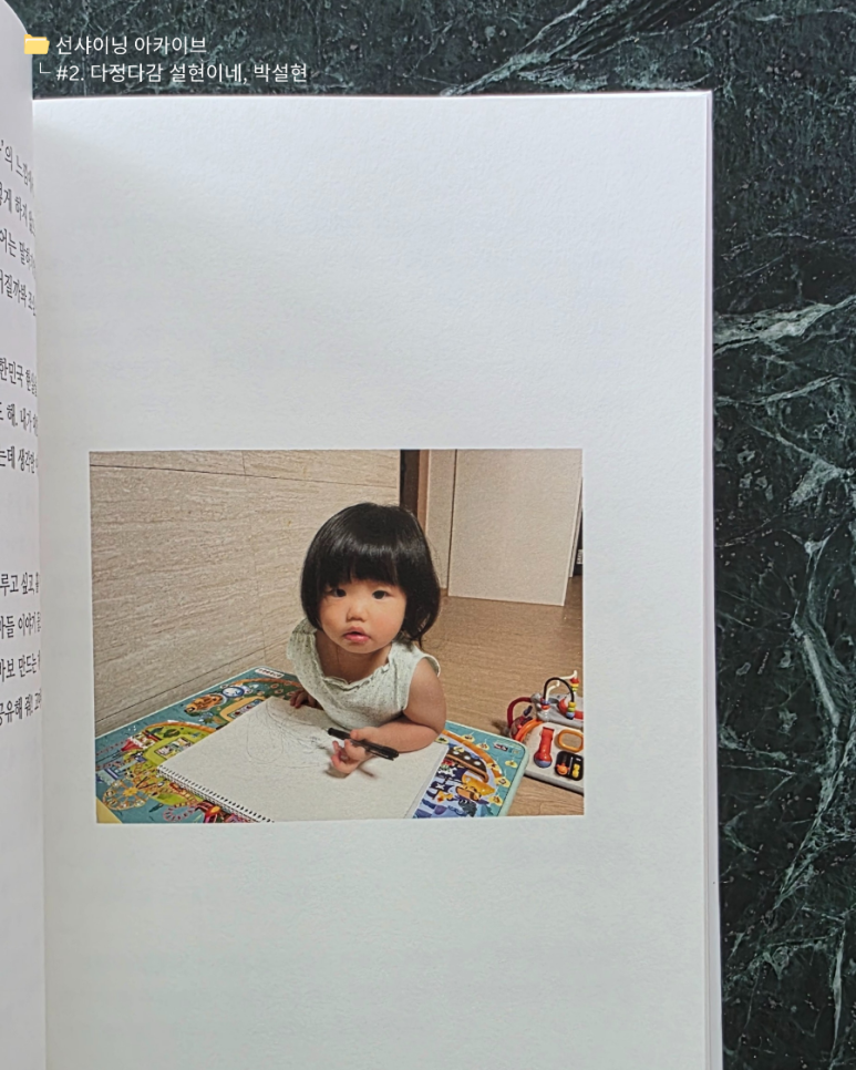 〈다정다감 설현이네〉는 결국 아이의 기록이면서도, 엄마 자신의 흔들림과 다짐, 그리고 조금씩 단단해져 가는 과정을 보여줍니다.