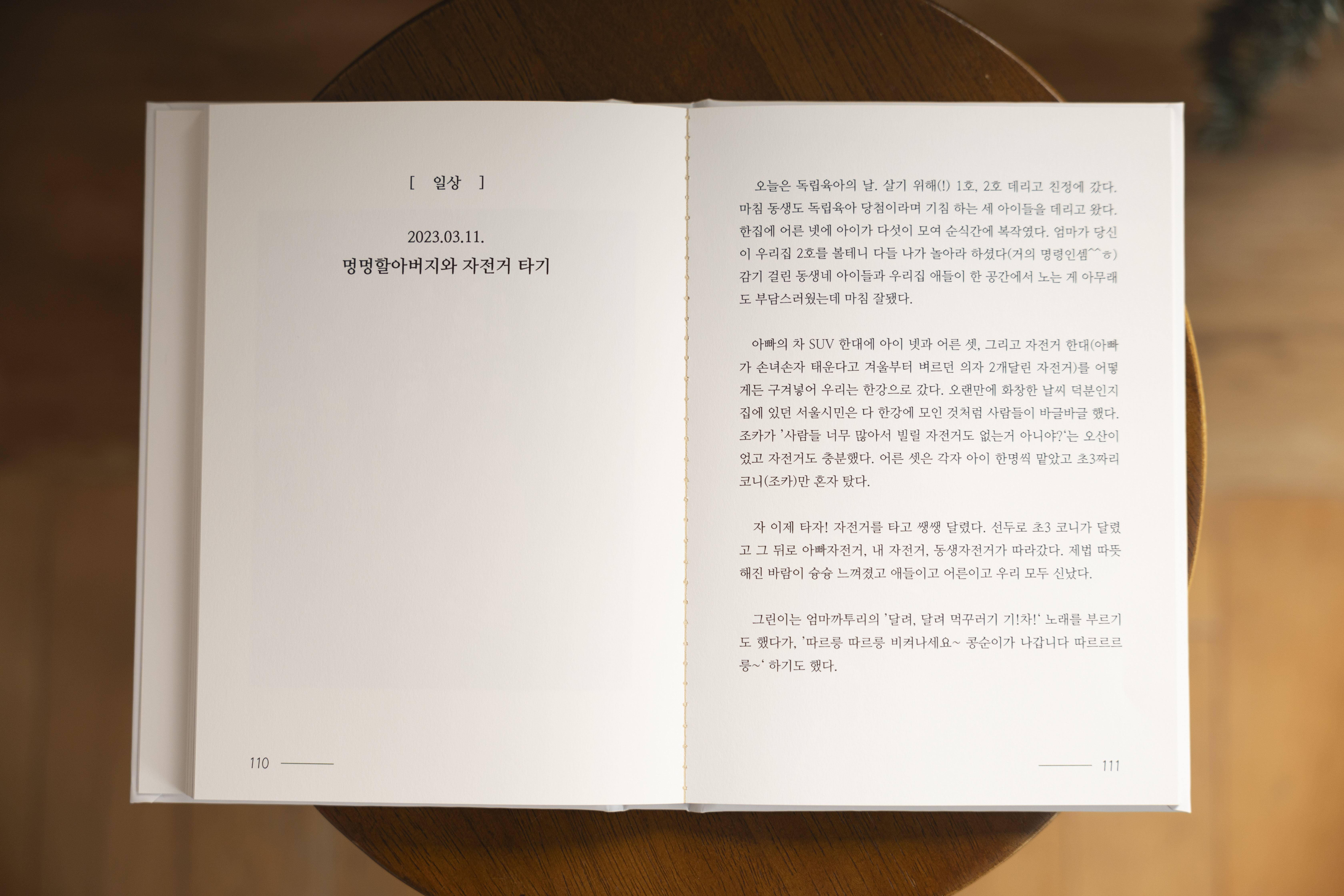 또 이 책은 아이의 성장을 빼곡히 기록한 육아일지도 아닙니다. 하루를 정리하려 책상에 앉으면, 아이보다 오히려 나의 과거가 더 생생하게 떠올랐기 때문이에요. 그래서 이 책은 아이를 키우며 희미했던 기억을 다시 불러낸, 과거 회상집에 가깝습니다.