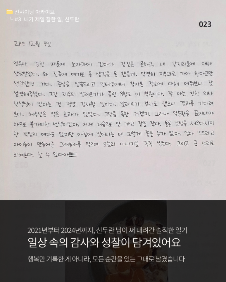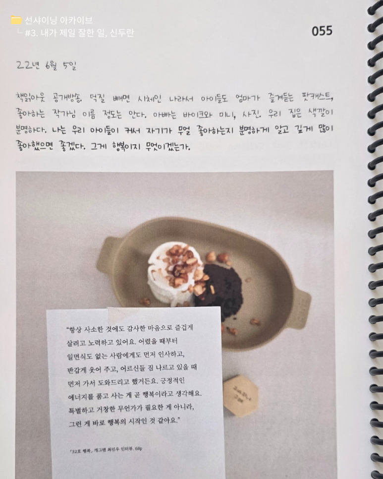 책 속 마지막에는 웃음을 자아내는 장면도 담겨 있습니다. 한 통화, 한 댓글, 작은 오해까지도 신두란 님에게는 모두 소중한 기록의 일부였습니다. 이런 태도야말로, 기록이 가진 힘을 가장 잘 보여줍니다.