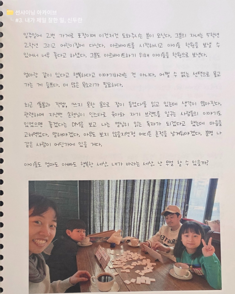 아이가 만든 그래놀라를 먹으며 힘을 내던 날, 버스 놓치고 뛰어가다 터져 나온 웃음, 그리고 가족이 함께 모여 보낸 따뜻한 저녁. 사람들이 쉽게 흘려보낼 장면들을 신두란 님은 놓치지 않고 붙잡아 글로 남겼습니다. 그녀가 택한 방식은 단순히 기록이 아니었습니다.