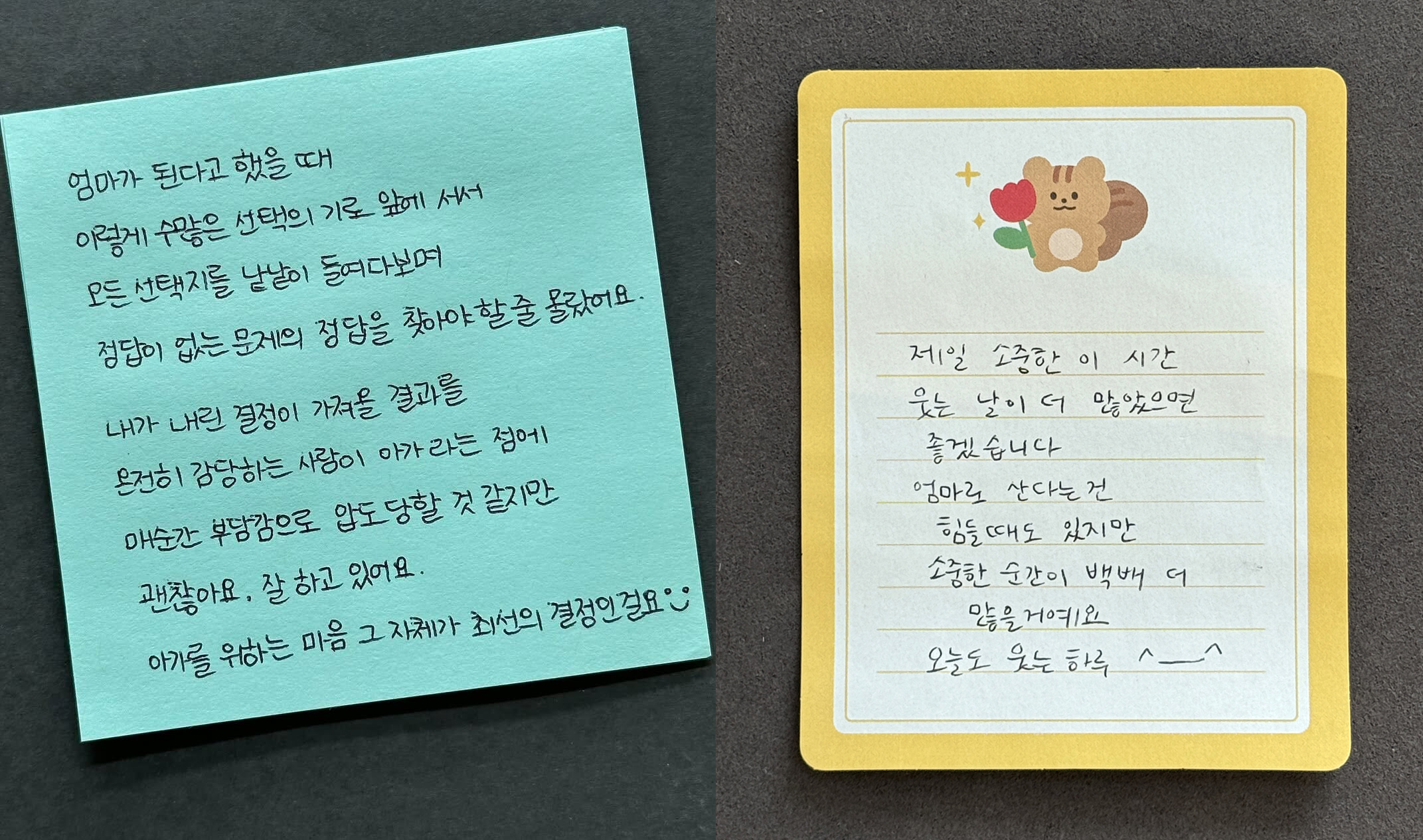 누군가의 편지가 다른 엄마의 상자 속에 담기고, 또 그 엄마의 편지가 다시 누군가에게 닿습니다. 따뜻한 마음으로 전해진 한 문장이, 또 다른 누군가의 하루에 다정한 온기를 남기고 있답니다.